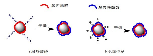 HT A20分子中的錨固部分由(甲基)丙烯酸、磷酸的均聚物或共聚物組成,通過和鈦白粉間的吸引力(配位作用、共價鍵)吸附在粒子表面,將粒子隔離開來。和樹脂相容的穩(wěn)定部分由丙烯酸酯、甲氧基聚丙二醇丙烯酸酯無規(guī)共聚物組成,賦予表面改性后的鈦白粉粒子良好的再分散性,并且能穩(wěn)定均勻分散在樹脂溶液和溶劑揮發(fā)后的樹脂中。在體系干燥過程中以及干燥后,和樹脂相容的部分能包覆在鈦白粉粒子表面,防止粒子聚集,使得鈦白粉粒子在樹脂中能均勻分散。圖2表示改性劑HT A20處理鈦白粉粒子后,HT A20在粒子表面的形態(tài)。圖2a表示在樹脂溶液或溶劑中,干燥前,改性劑的錨固部分和鈦白粉粒子間通過共價鍵、配位鍵結合在粒子表面上,聚丙烯酸酯部分充分伸展,通過空間位阻作用穩(wěn)定粒子;干燥后,聚丙烯酸酯部分包覆在粒子上或和樹脂基體互相滲透。圖2b表示在水性體系中,干燥前,改性劑的聚丙烯酸錨固部分和鈦白粉粒子間通過共價鍵、配位鍵結合在粒子表面上,依靠靜電斥力穩(wěn)定粒子;干燥后,聚丙烯酸酯部分包覆在粒子上或和樹脂互相滲透??梢?,雙親型嵌段聚合物改性劑HT A20對鈦白粉進行有機表面處理后,在有機溶劑體系和水性體系中,都能提高鈦白粉在介質(zhì)中的分散穩(wěn)定性并改善鈦白粉和樹脂的相容性。